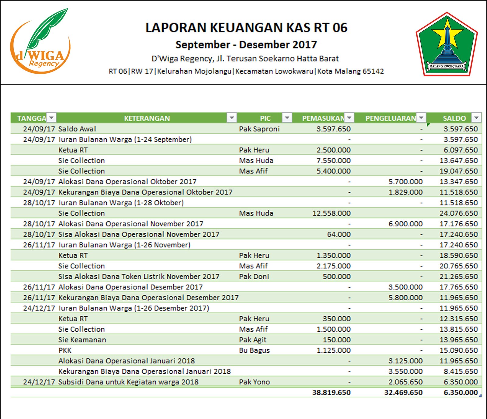 Laporan Keuangan Kas Rt 06 D Wiga Regency Periode September Desember 2017